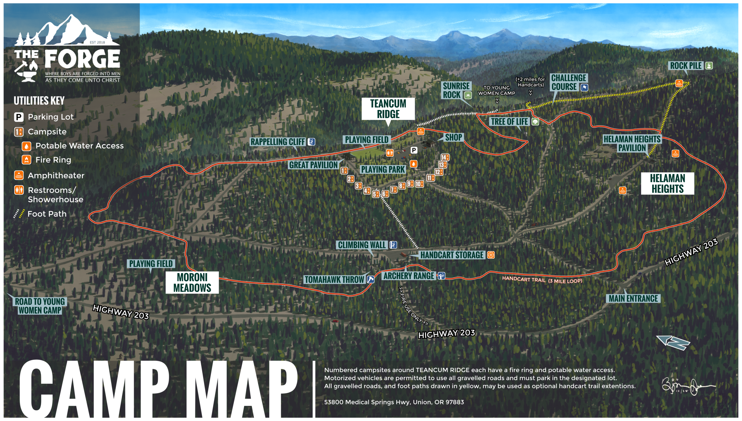 Location & MapS Getting Here The Forge is located near Union, Oregon. The front gate is on Highway 203 near mile marker 12, and is marked with a small neon green sign displaying address. Camp Map Download Map